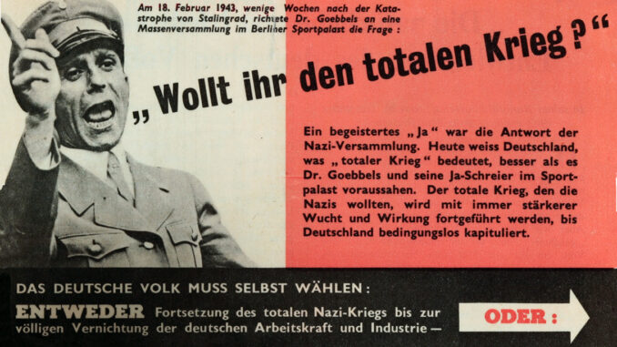 Adolf Hitler, nationalsocialisten, ville skapa en ny värld där nazisternas planekonomiskt tänkande skulle råda. Allt ska styras politiskt och inga marknadskrafter eller självbestämmande får förekomma. Oliktänkande, utvalda folkgrupper, andra politiska inriktningar, självförsörjning skulle bekämpas och elimineras. Håll dig på mattan så blir du lycklig blir budskapet.